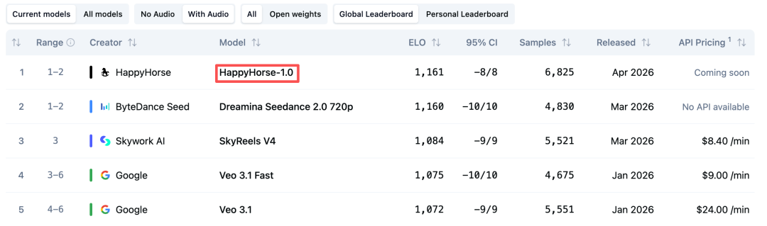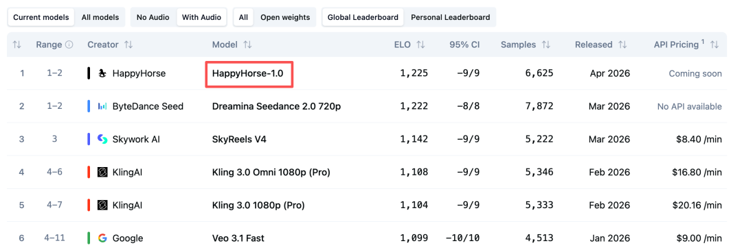 而在有音频赛道,目前 HappyHorse-1.0 也已经拿下全球第一的成绩,超越 Seedance 2.0。