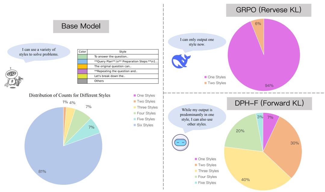 研究团队进行了一项有趣的实验:通过SFT让模型学习到多种不同风格的回答方式,仅凭前缀即可判断模型采用了哪种风格;然而经过标准GRPO训练后,模型几乎只保留了一种风格。