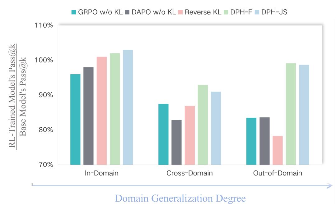 实验表明,DPH-RL不仅能缓解Pass@k下降问题,还可同时提升Pass@1 ,并在跨域任务上展现出更优的稳定性与泛化能力。更重要的是,这一结果启示我们:在RL后训练时代,保住多样性与提高奖励同等重要。