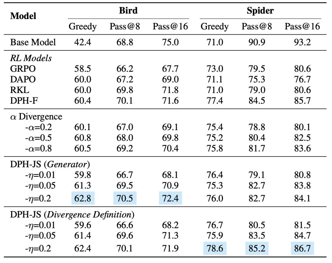 DPH-F与DPH-JS不仅Greedy分数最高,其Pass@8分数也超越了Base Model。其中,DPH-JS的Pass@8分数较GRPO高出4.3%。在更大的k设置下,DPH-RL更接近base model,缓解了Pass@k的崩塌。
