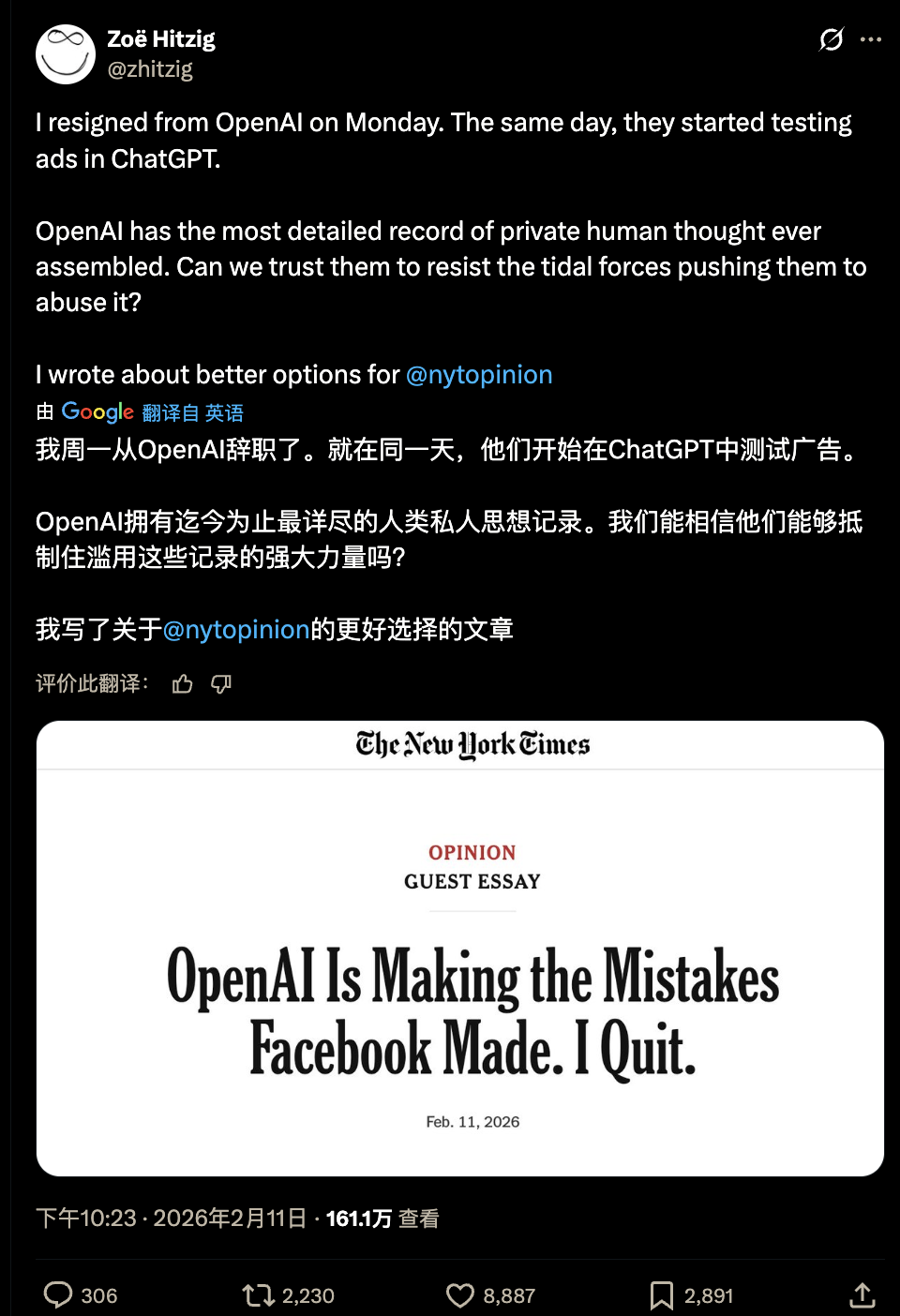 在 OpenAI,诸如 Jerry Tworek 这样主导核心推理模型开发的关键人物,以及因不满商业化妥协而离开的 Zoe Hitzig,都构成了这份长长离职名单的一部分。