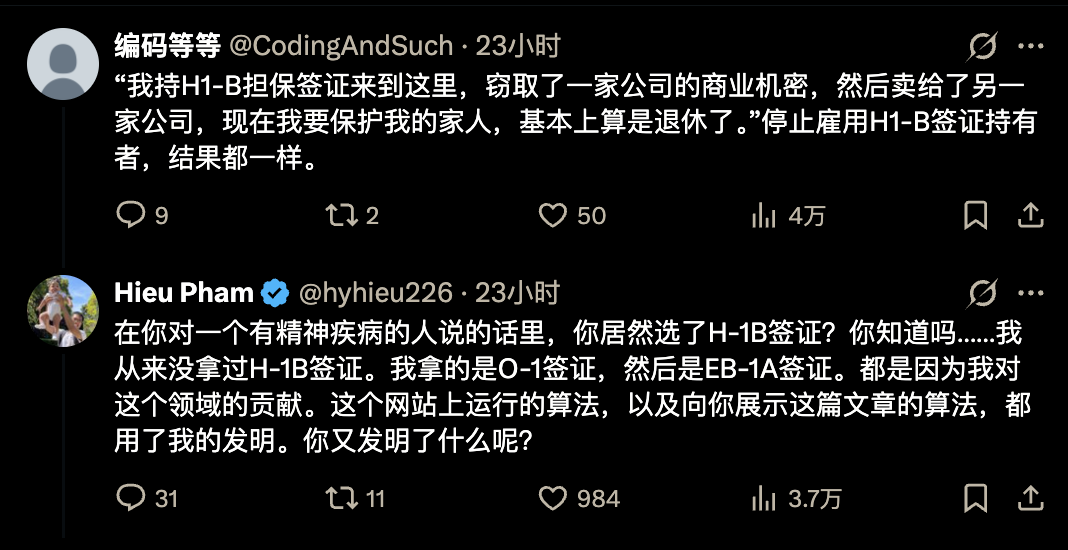 评论区甚至有人将持 H-1B 的外籍员工一概污名化为「商业间谍」。