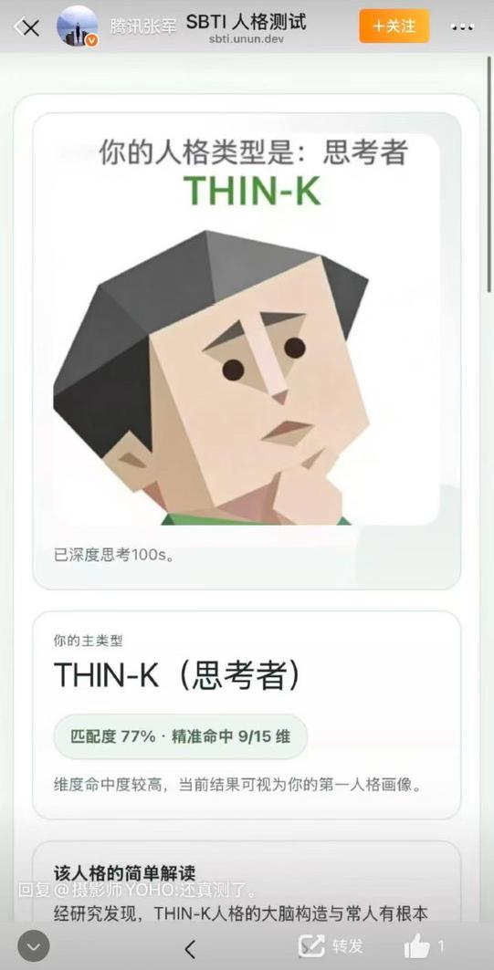 SBTI直接把MBTI严谨的框架解构,变成让人捧腹或汗颜的标签,迅速发展成一种社交货币,在微信朋友圈里大肆传播后,冲上全网热搜甚至腾讯公关总监张军也玩上了。