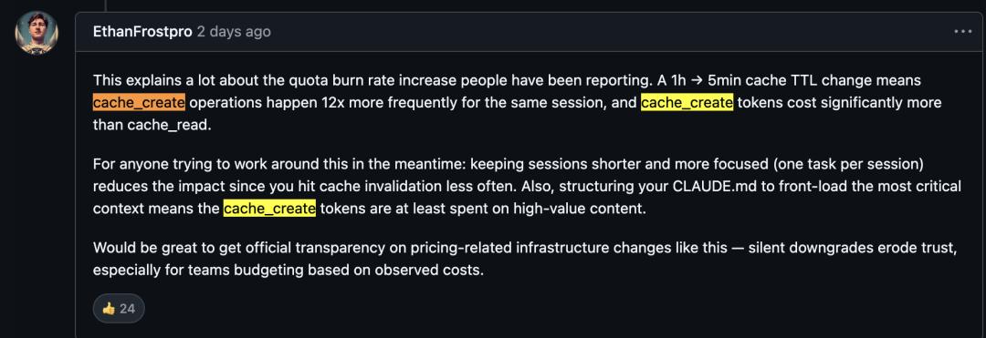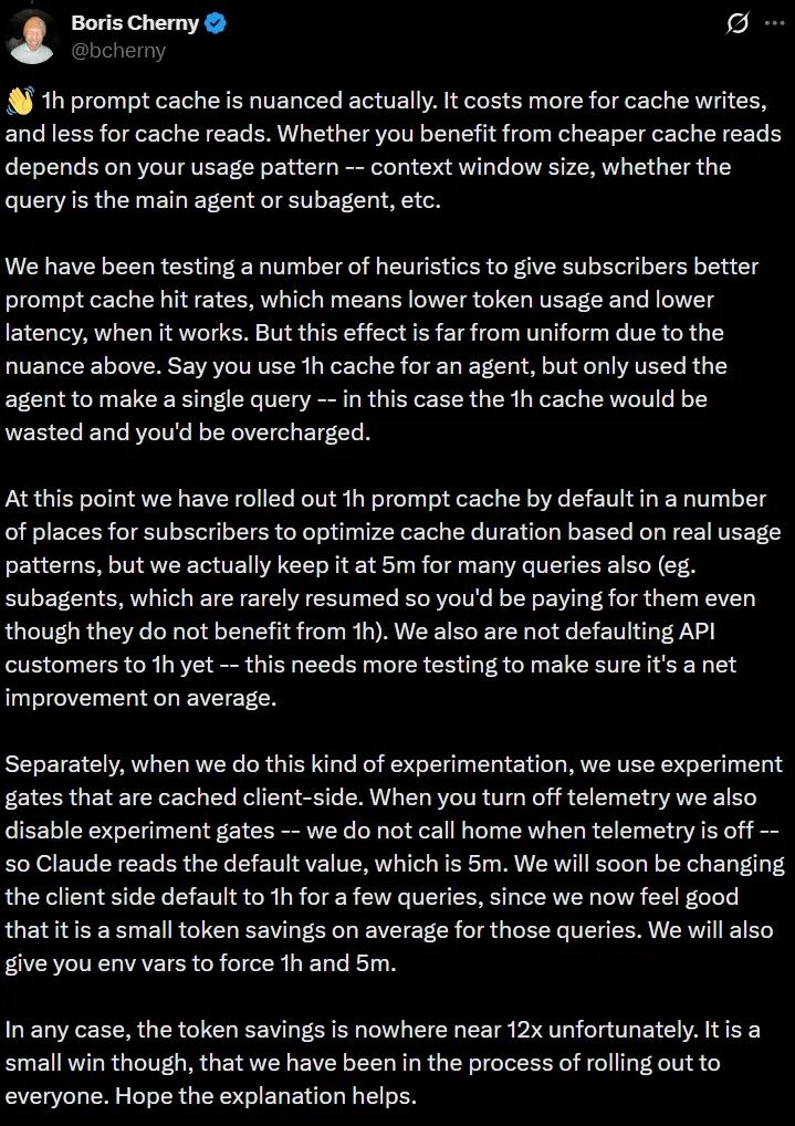 他认为5分钟TTL对整体而言「更便宜而不是更贵」,因为「相当一部分Claude Code请求是一次性调用,缓存上下文只用一次就不再访问」。