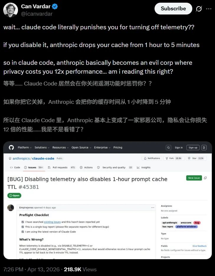 GitHub里,Claude Code用户贴出真实日志:开启telemetry时,ephemeral_1h_input_tokens轻松破3万;一关telemetry,1h直接归零,全走5m缓存。同一段代码,缓存miss率直接飙12倍。