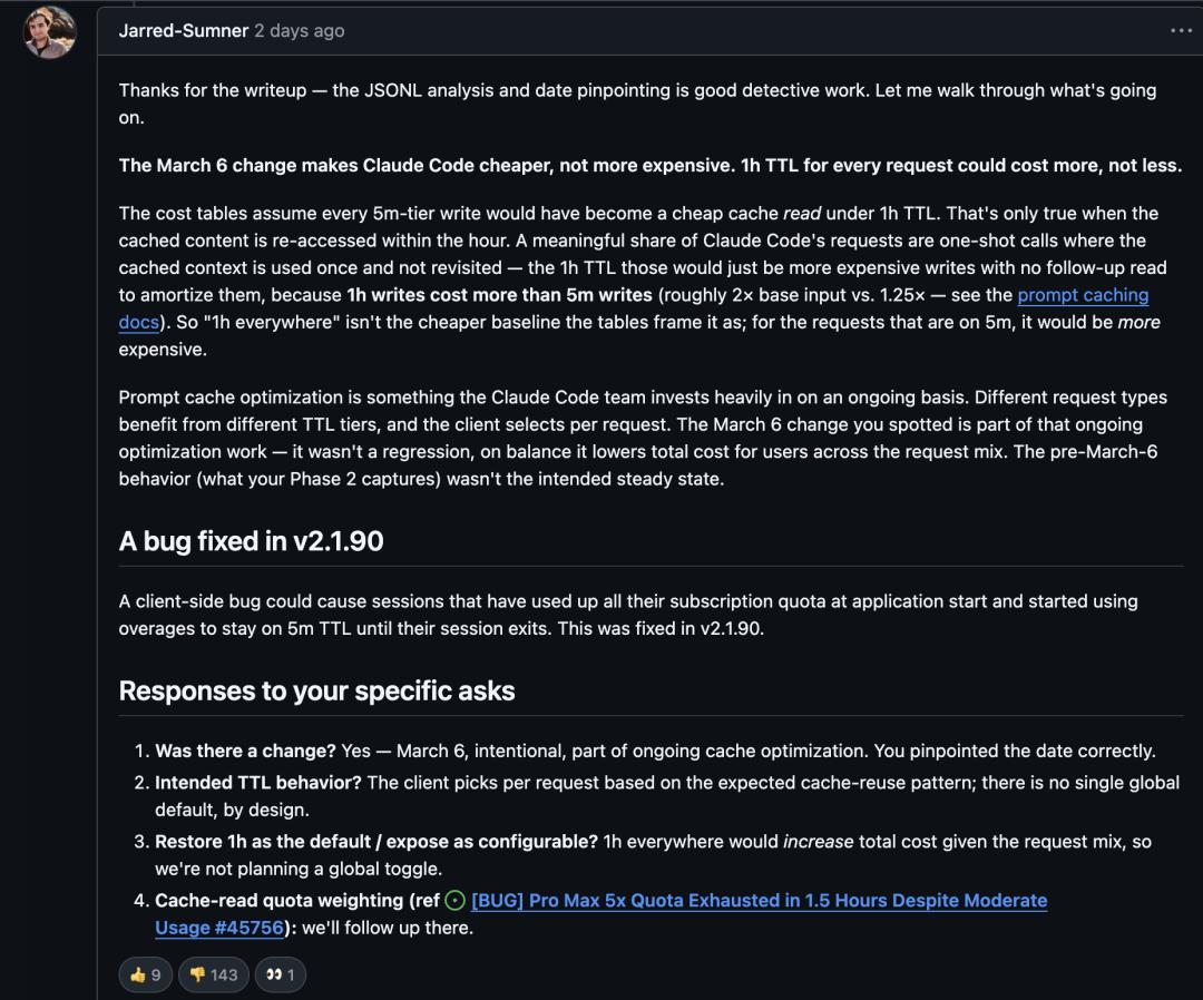 Anthropic另一位工程师、Bun运行时的创造者Jarred Sumner则回应了3月的TTL回退问题。