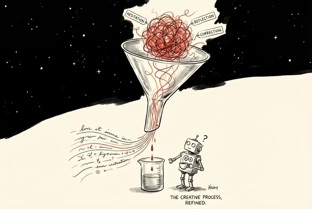 这些词,到 2024 年为止,我们还觉得它们专属于人类。当蒸馏的对象从「判断结果」变成「思考过程」的时候,模型蒸馏和人的蒸馏之间的那条边界,就已经开始模糊了。