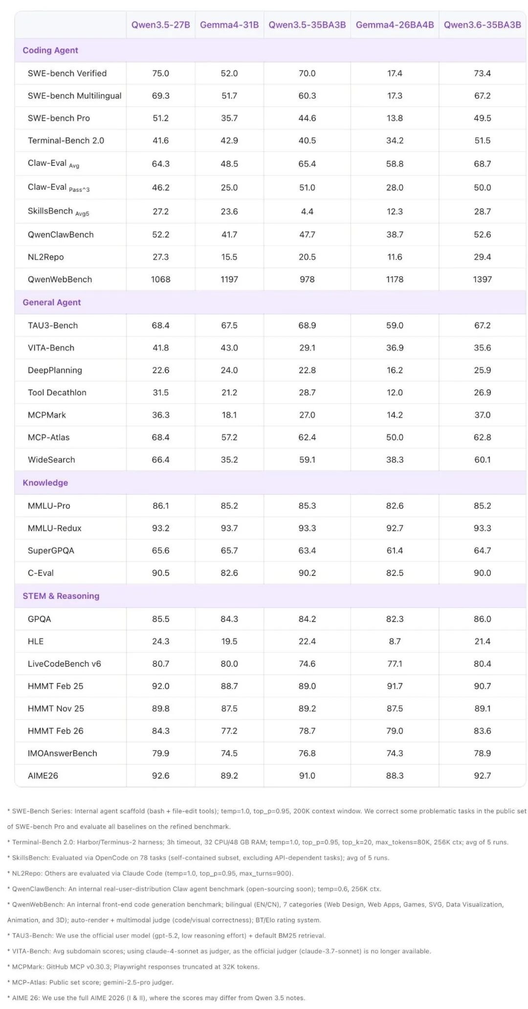 下文将全面展示 Qwen3.6-35B-A3B 与同规模模型在各类任务和模态上的评测对比结果。