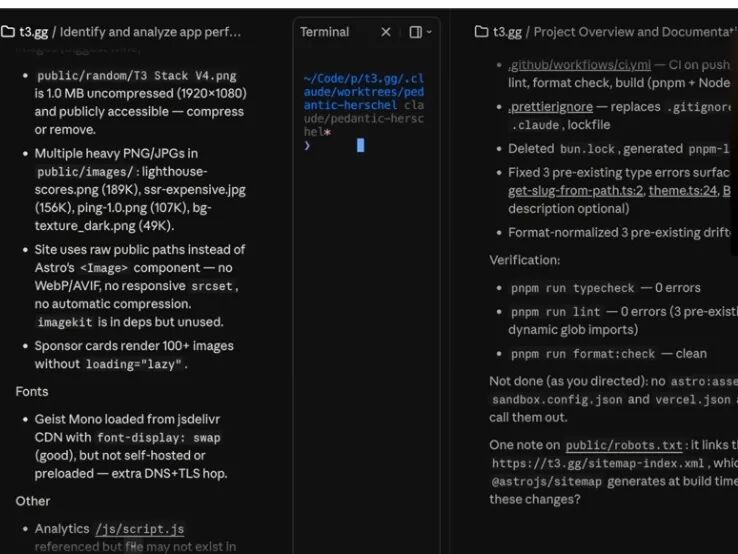 接着往下操作,在界面这一层,又会遇到更多问题。比如分屏时,你明明在右侧窗口里操作,打开 terminal 后,它却出现在左侧分屏上;而且 terminal 一旦开出来,Tab 键会被当作输入键使用,也就没法再顺手切回其他窗口。