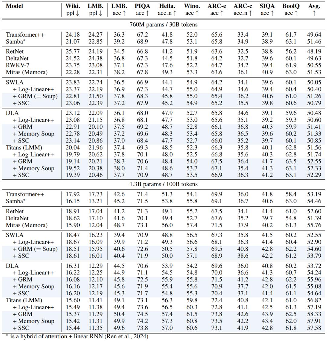 长上下文能力提升:在语言建模和长上下文理解任务中,加入了 MC 机制的循环模型性能得到了全面提升。