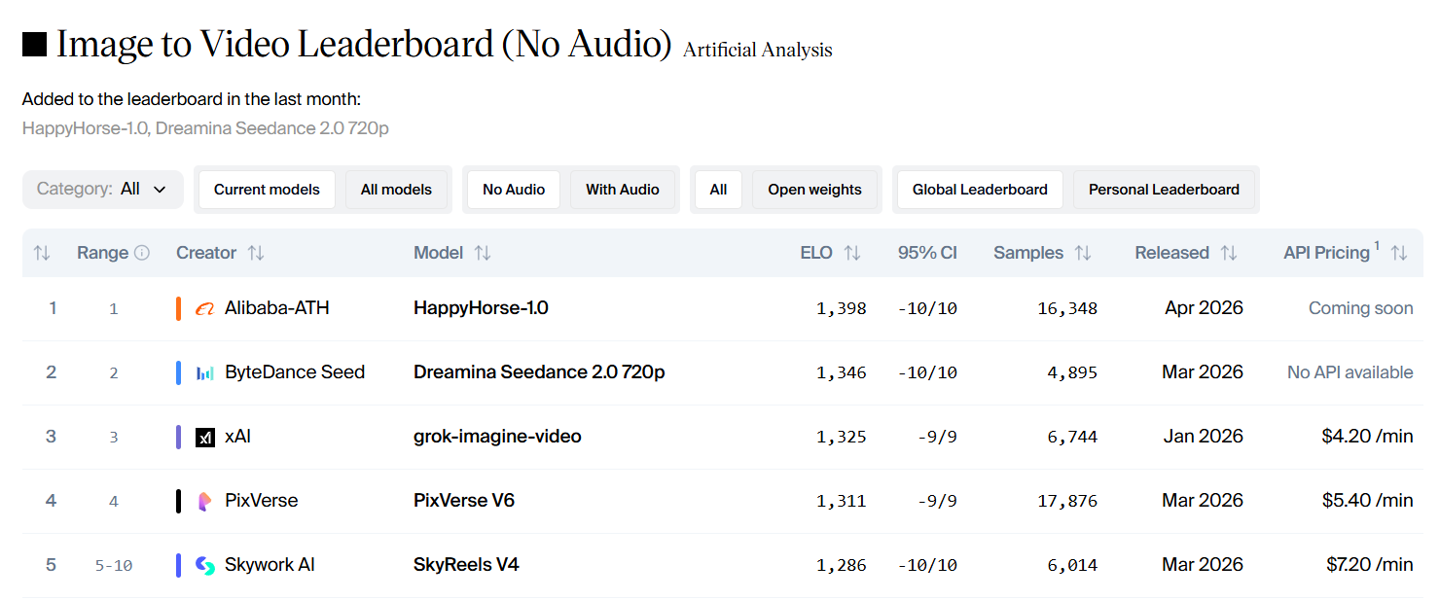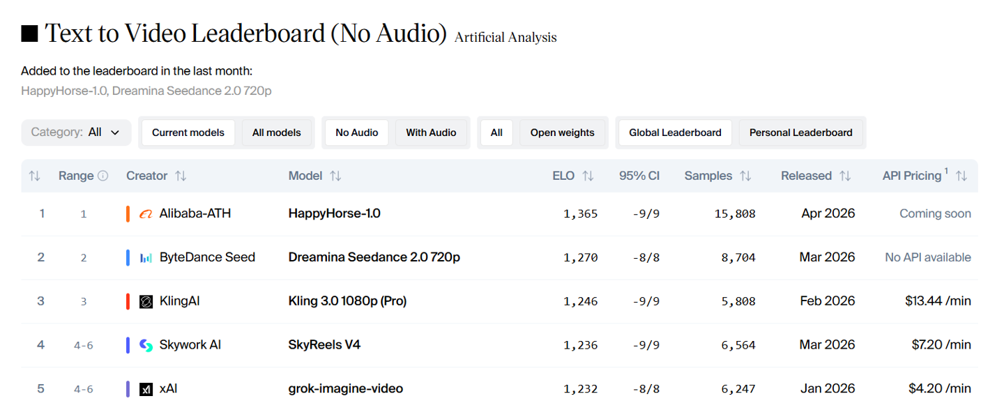 IT之家查询获悉,HappyHorse-1.0 目前登顶 Artificial Analysis 的 AI Video Arena 排行榜,超过了字节跳动的 Seedance 和快手可灵等模型。