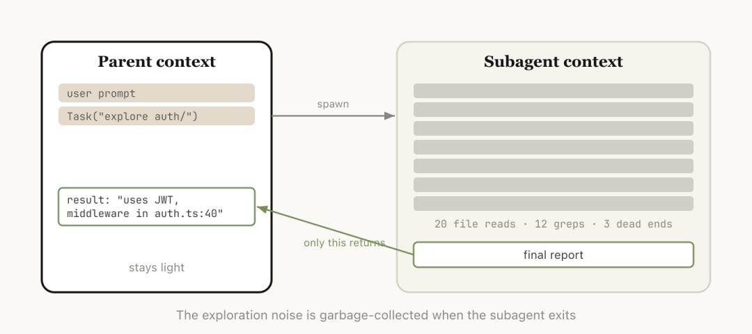 它拿到一个全新的独立上下文窗口,在里面完成所有脏活,中间过程全部留在子窗口里,最后只有一份结论带回主会话。