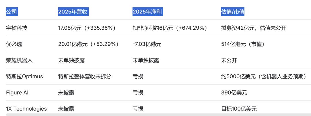 先看国内玩家。宇树科技,这家成立于2016年的杭州公司,2025年营收达到17.08亿元,同比增长335.36%;扣非净利润约6亿元,同比增长674.29%。