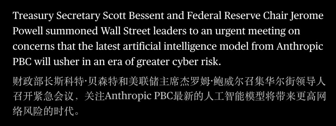 4 月上旬,美国财政部长 Scott Bessent 与美联储主席 Jerome Powell 已召集华尔街主要银行高管在华盛顿紧急开会,讨论 Mythos 以及类似模型可能带来的新型网络安全风险。