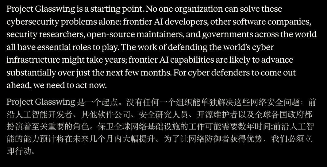 Anthropic 在 Glasswing 页面里写道,前沿 AI 开发者、软件公司、安全研究员、开源维护者和政府都扮演着不可替代的角色。