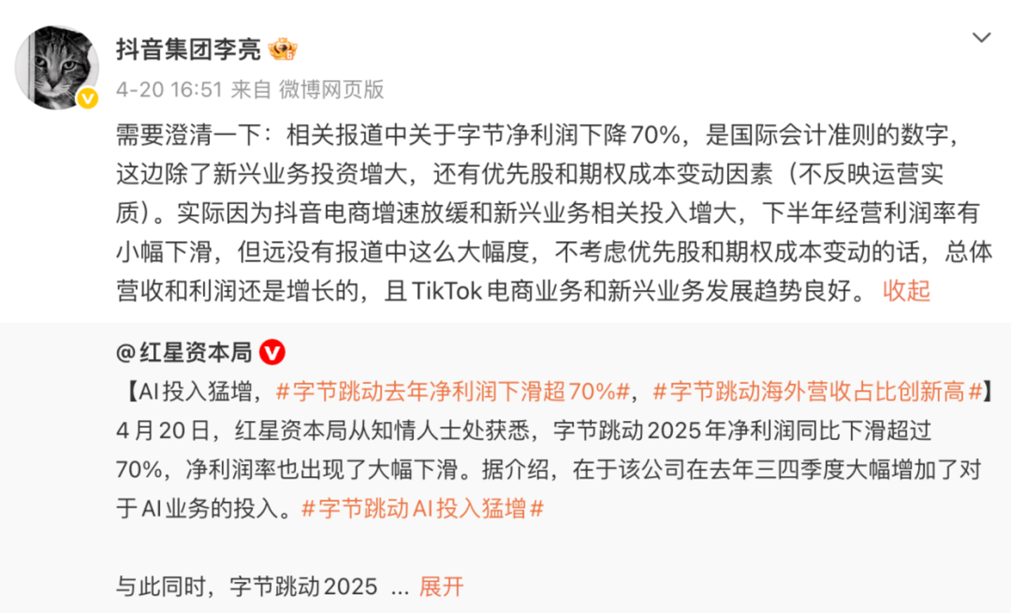 抖音集团副总裁李亮很快回应:净利润下滑是国际会计准则的数字,包含优先股和期权成本变动,不反映运营实质。剔除这些会计因素后,字节总体营收和利润仍然是增长的。