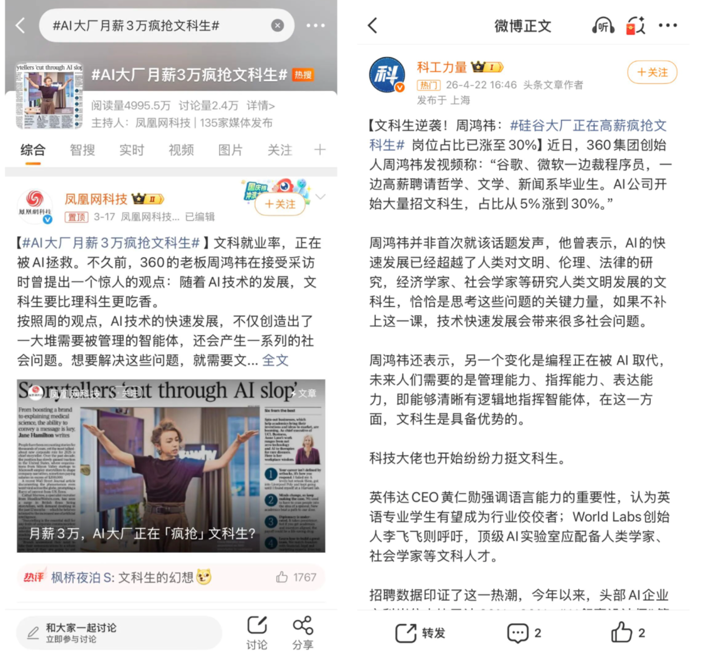 3月“AI大厂月薪3万疯抢文科生”冲上了热搜。360创始人周鸿祎大视频称:“AI公司开始大量招文科生,占比从5%涨到30%”。英伟达CEO黄仁勋同样强调过语言能力的重要性。打开招聘软件,AI叙事设计师、AI伦理研究员等岗位要求里写的是中文、编剧、社会学、新闻学等文科专业。