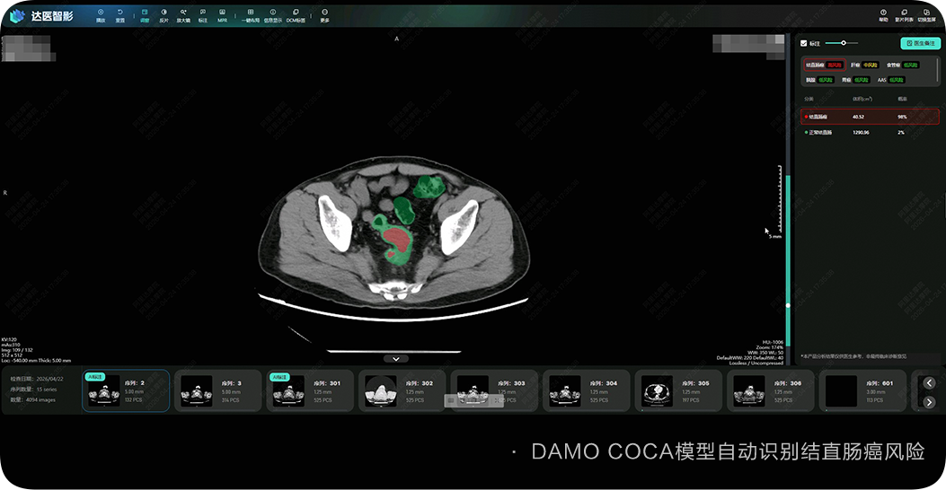 IT之家 4 月 28 日消息,阿里巴巴达摩院今日(4 月 28 日)联合广东省人民医院等机构研发出肠癌筛查 AI 模型 DAMO COCA,从 2.7 万人的平扫 CT 影像中精准识别 5 例漏诊肠癌,敏感性、特异性分别达到 86.6% 和 99.8%,在国际上首次提出了一种无需肠道准备、患者“无感”的肠癌机会性筛查方法。