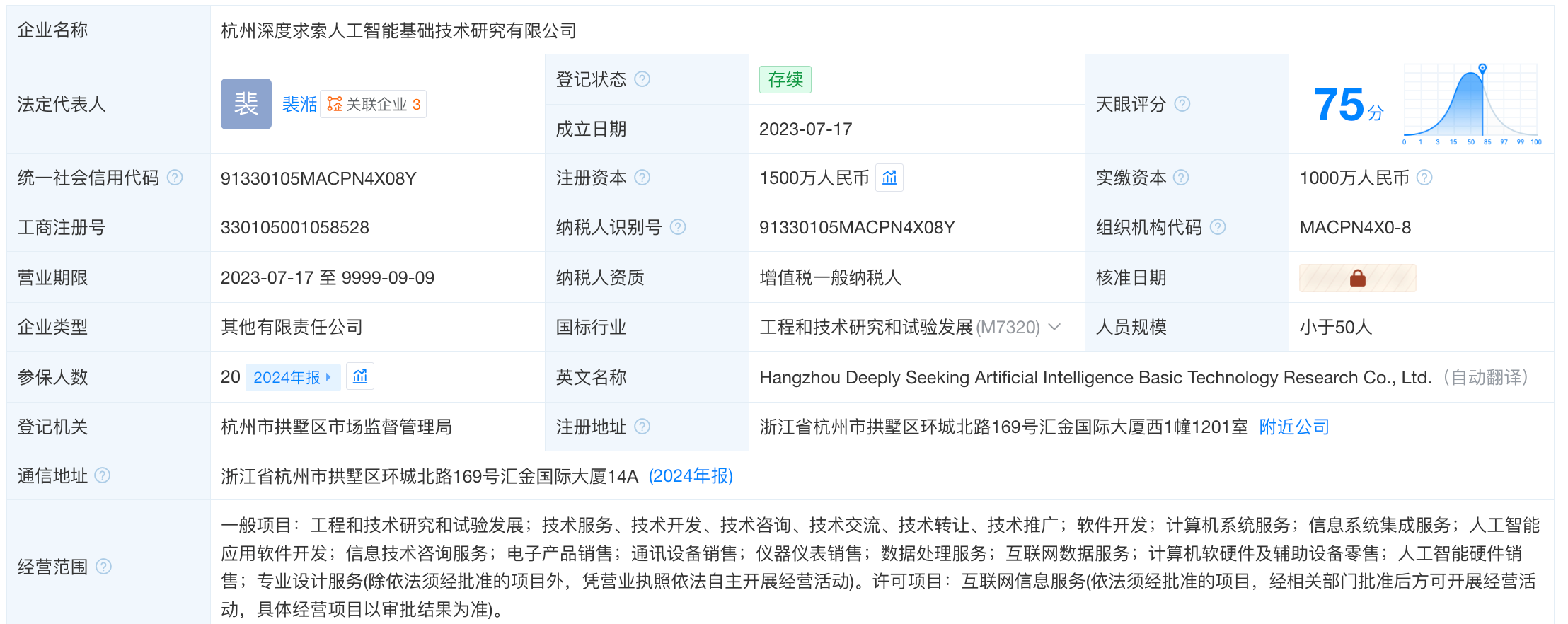 凤凰网科技讯 4月28日,天眼查显示,杭州深度求索人工智能基础技术研究有限公司(简称“DeepSeek”)注册资本由1000万元增加至1500万元,增幅50%。其中梁文锋认缴的注册资本由10万元增加至510万元,持股占比由1%提高至34%,但其作为实际控制人的最终受益股份达到84.3%。宁波程恩企业管理咨询合伙企业(有限合伙)持股比例由99%降至66%。