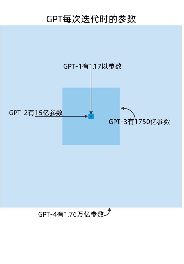图注:OpenAI GPT模型迭代参数变化,其中GPT-1参数为1.17亿,GPT-2为15亿, GPT-3为1750亿,GPT-4则增至1.76万亿