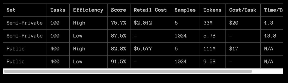 在高效率模式下,75.7%的得分符合ARC-AGI-Pub的预算规定(成本低于1万美元),因此有资格占据公共排行榜的首位。