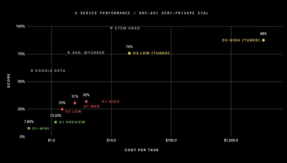 为何o3的得分远超过o1?同样,o1的得分又为何远超过GPT-4o?我认为,这一系列结果为通用人工智能的持续追求提供了极有价值的数据点。