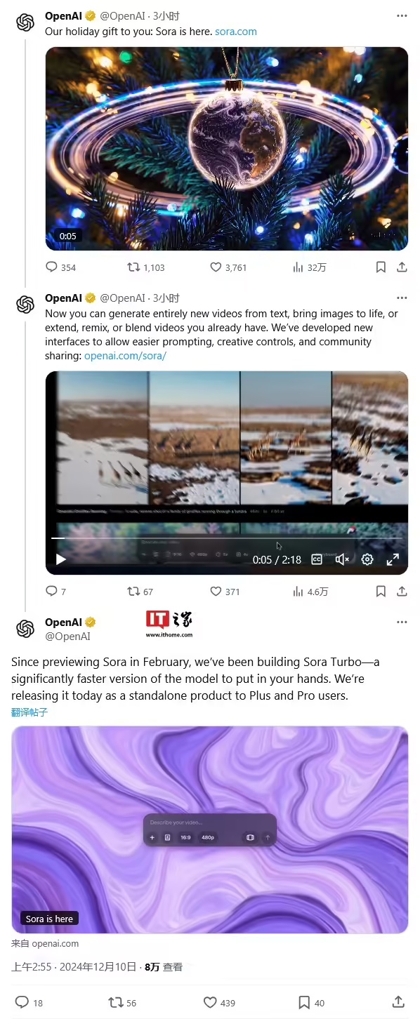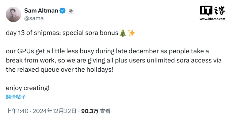 IT之家 12 月 23 日消息,北京时间昨日,OpenAI CEO 阿尔特曼在 X 平台宣布,所有 ChatGPT Plus 订阅用户可在圣诞假期期间完全无限量使用 Sora。“12 月底,随着人们放假,我们的 GPU 资源会稍微空闲一些。所以我们为所有 Plus 用户提供假期期间无限制的 Sora 使用权限!尽情创作吧!”