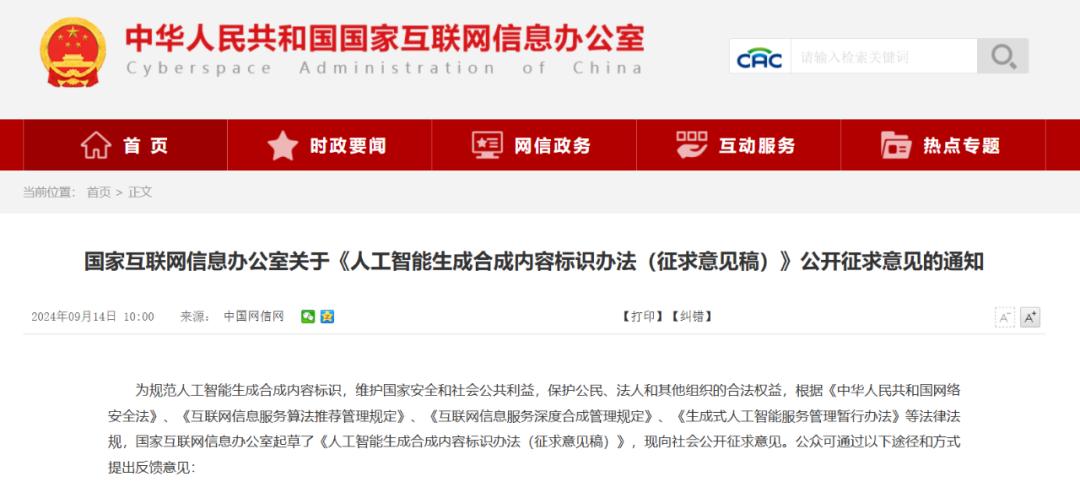 今年9月,国家网信办已经发布《人工智能生成合成内容标识办法(征求意见稿)》,要求从视频制作和发布的源头做好信息管理。其中明确提出两种人工智能生成合成内容标识的种类,即“显式标识”与“隐式标识”,还明确了两类标识所应当适用的场景,将《深度合成规定》第十七条所提出的“显著标识”与“显式标识”建立了直接的对应关系。