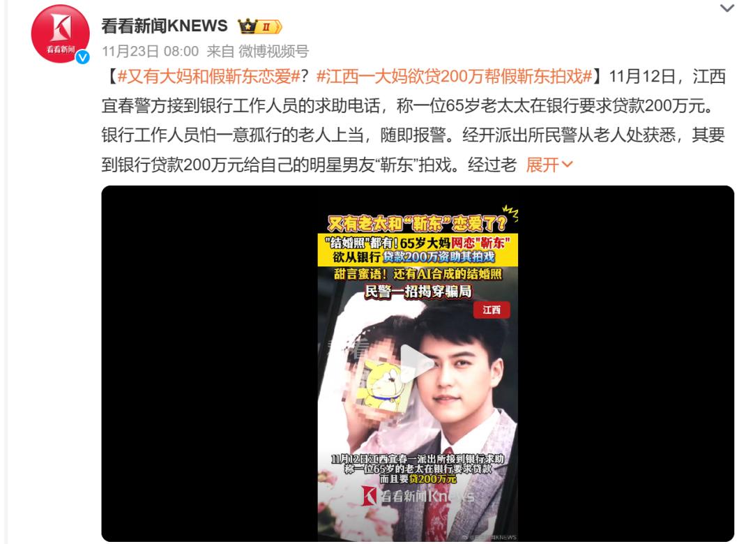 据报道,今年11月,江西一位65岁老人到银行办理业务,声称要贷款200万元给男朋友“靳东”拍戏。经调查发现,老人手机里的“靳东”出自AI合成的视频。