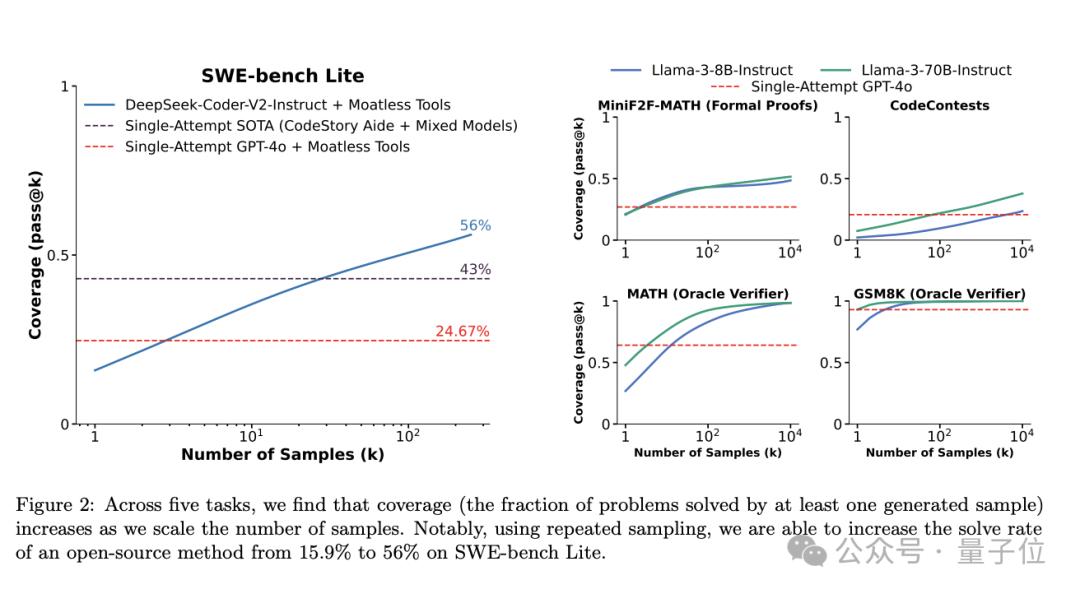 在一系列模型和任务中,重复采样可以显著提高使用任何生成样本解决问题的比例(即覆盖率)。当可以识别出正确的解决方案时(通过自动验证工具或其他验证算法),重复采样可以在推理过程中放大模型的能力。