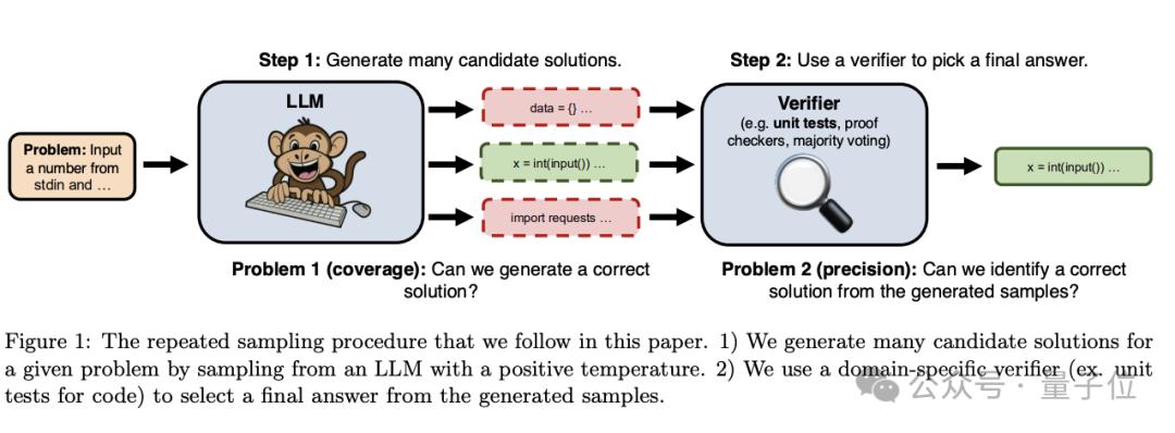 本文遵循的重复采样程序,首先通过大模型中采样,为给定的问题生成许多候选解。