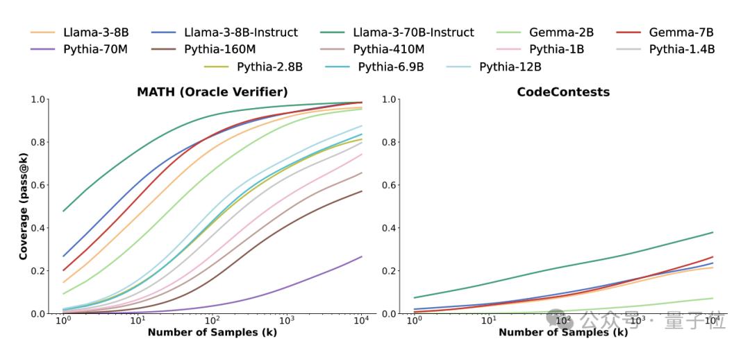 在不同参数量、不同模型以及后训练水平(基础模型和微调模型)下,都显示通过重复采样Scaling推理时间计算,覆盖率都有一致的提升。