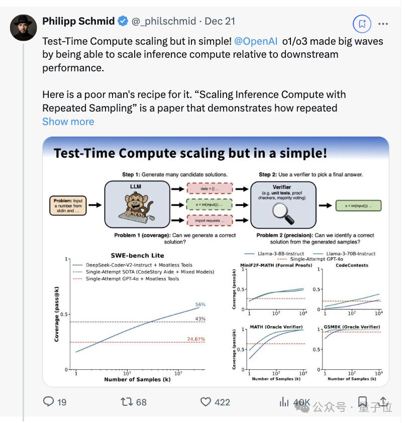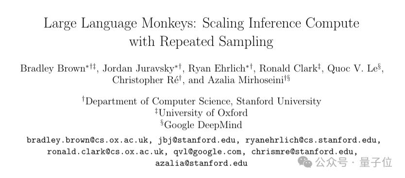 当时,来自斯坦福、牛津以及谷歌DeepMind的团队提出通过重复采样来扩展推理计算量——