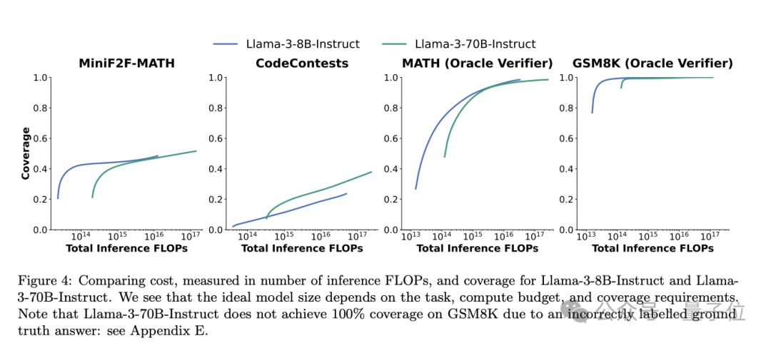 比较 Llama-3-8B-Instruct 和 Llama3-70B-Instruct 的成本(以推理 FLOPs 数量衡量)和覆盖率。当FLOPs预算固定时,在 MiniF2F、GSM8K和 MATH 上,Llama-3-8B-Instruct的覆盖率总是高于更大(更贵)的 70B 模型。然而,在 CodeContests 中,70B 模型几乎总是更具成本效益。