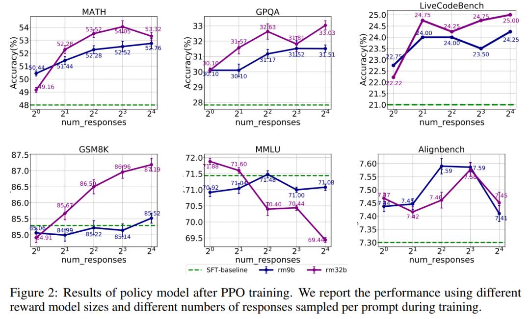 实验结果显示,随着每个提示采样的响应数量增加,模型在大多数任务中的性能都有明显提升。研究指出,这一趋势表明,更多样化的响应为策略模型提供了更丰富的奖励信号,使其能够更全面地学习不同情况下的优化策略,从而在整体性能上获得提升。