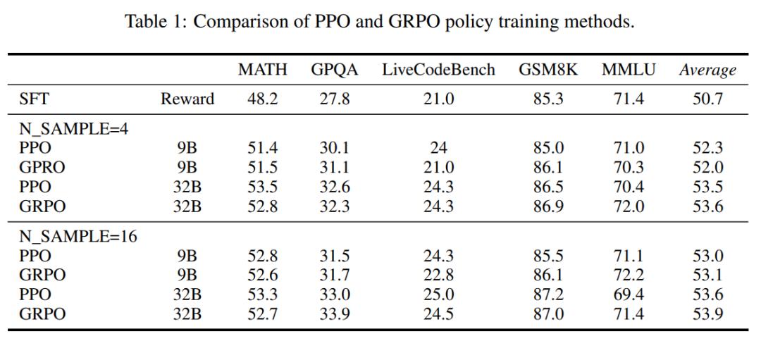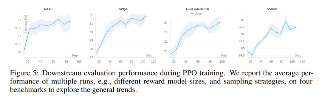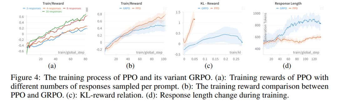 研究团队还比较了 PPO 和 GRPO 两种训练算法,发现它们在最终性能上差异较小,但表现出了不同的训练行为。例如,PPO 的奖励增加较为稳定,而 GRPO 在训练过程中显著增加了策略模型与初始模型的发散性,并导致响应长度的明显增长。