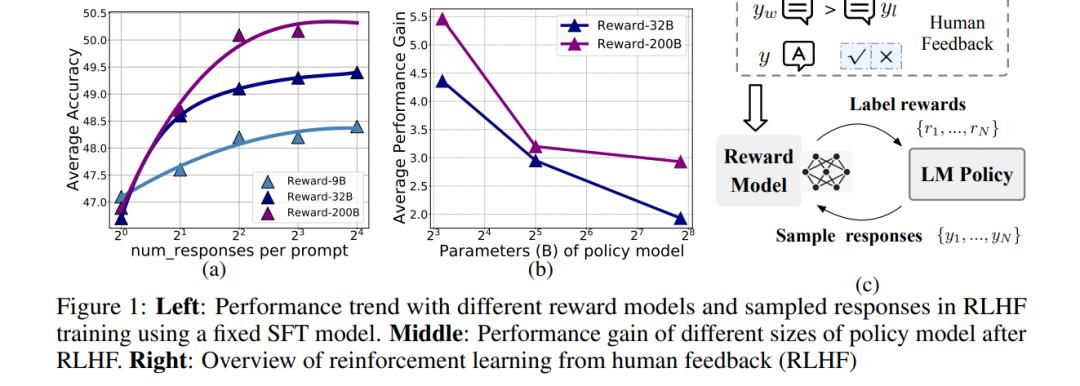 图|使用固定监督微调(SFT)模型进行 RLHF 训练时,不同奖励模型和采样反应的性能趋势(左); RLHF 后不同大小的策略模型的性能增益(中间)。 RLHF 概述(右)。