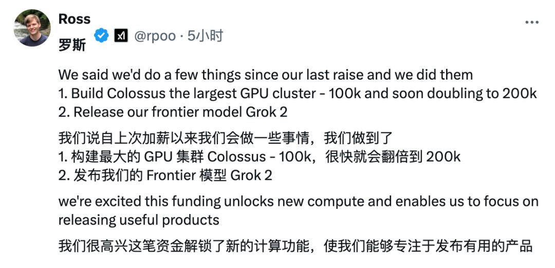 1. 建造了 Colossus——世界上最大的 GPU 集群,目前拥有 100000 个 GPU,很快将扩展至 200000 个 GPU。