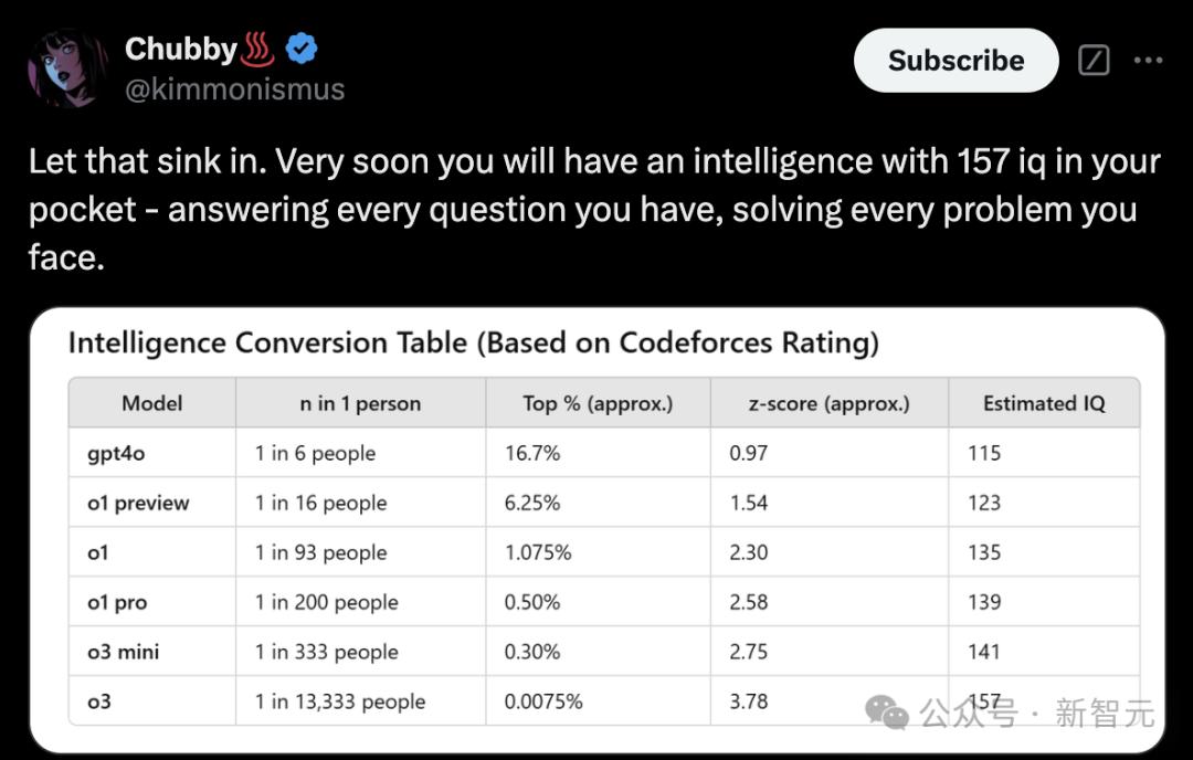 【导读】OpenAI o3的智商,竟然已经高达157,碾压99%的人类?这张OpenAI模型智商图全网疯转。甚至有人大胆预测:达到陶哲轩智商(225-230)的大模型,应该会很快出现了。