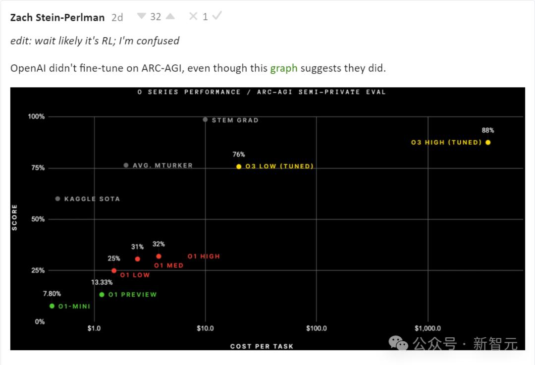OpenAI研究员Zach Stein-Perlman反驳说,他们没有针对ARC对o3做过微调。