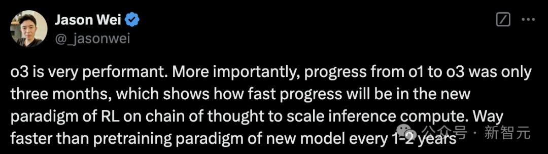 OpenAI研究员Jason Wei称,从o1到o3仅用了3个月的时间,这表明在新范式下,进展远快于预训练范式每1-2年更新一次模型的速度。