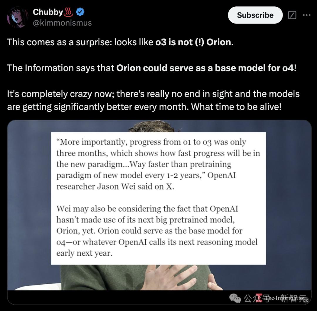 Information独家爆料称,o3并不是代号为Orion的模型。相对的,Orion可能会作为o4的基础模型。