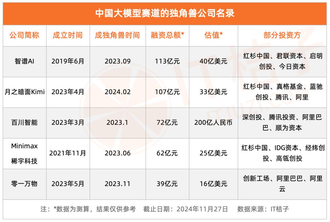所以,几家头部企业基本都是2023下半年到2024年初这半年多的时间内密集融资,快速晋升独角兽。他们背后的投资方也是清一色的顶级头部机构,如红杉中国、经纬创投、深创投等,以及腾讯投资、阿里巴巴两大互联网巨头也各自下重注。