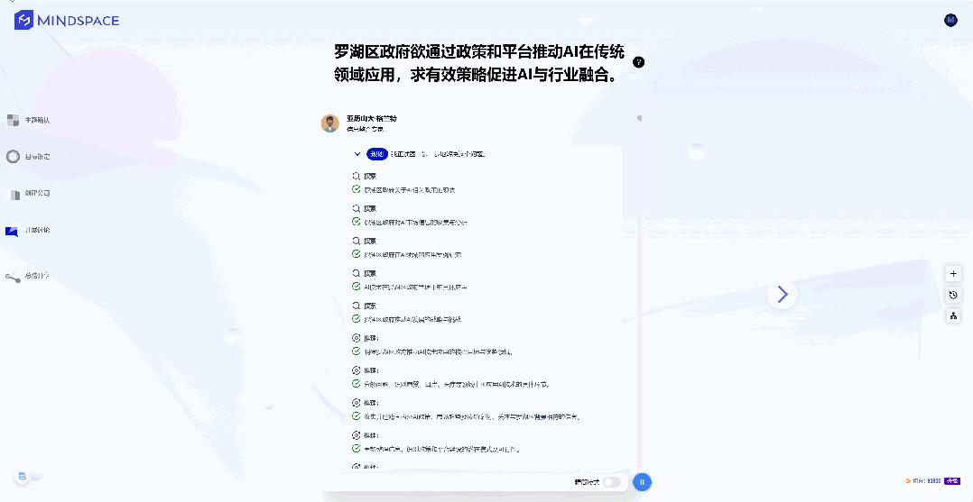 根据提问,MindSpace能够输出一份超过10000字的长篇报告,生成大约15分钟,而一份相对完整的报告可能要花2到3个月完成。“虽然现在的报告看起来像我们刚入行时60分的水平,但未来将不断迭代到80分、90分,到那时候AI智慧咨询的供给就像喝水一样简单。”