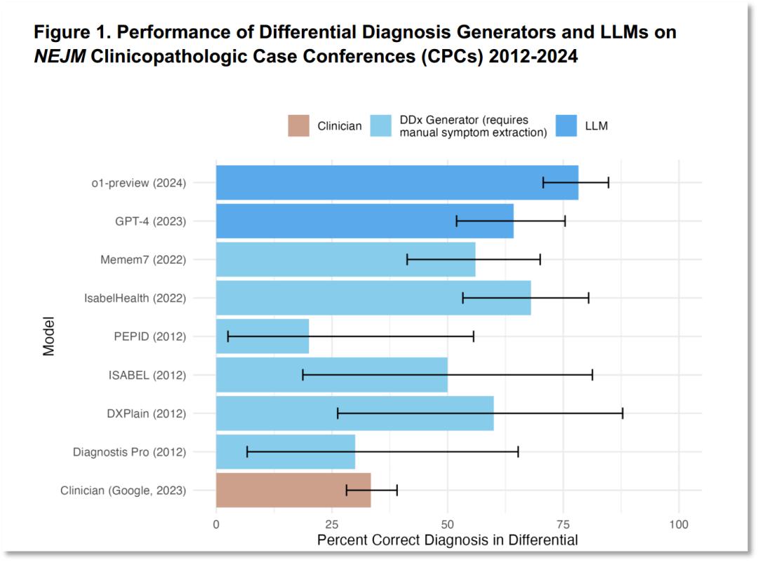 结果显示,o1-preview模型在多项任务中表现出卓越的能力,在鉴别诊断生成(判断“这是什么病”)、诊断临床推理(判断“这最可能是什么病”)和管理推理(判断“应该如何治疗”)方面,甚至达到了超人类水平。