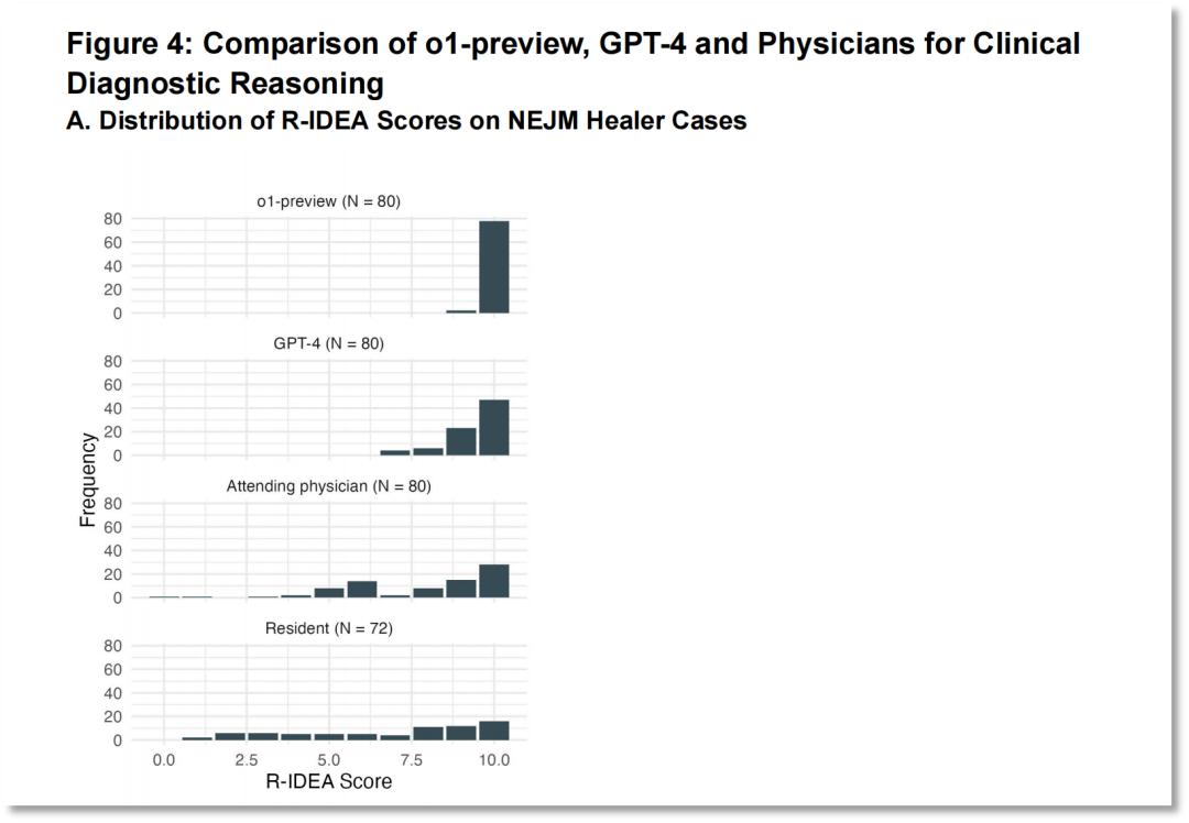 结果表明,o1-preview的表现明显优于GPT-4、主治医师和住院医师。在80例病例中,有78例获得了完美的R-IDEA评分。R-IDEA评分是一个10分制量表,用于评估临床推理能力。