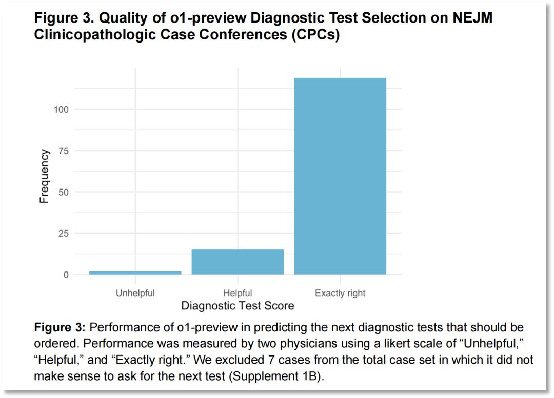 这些实验由医学专家使用经过验证的心理测量方法进行评估,旨在将o1-preview的性能与以前的人类对照组和早期大型语言模型基准进行比较。结果表明,与医生、已有的大语言模型相比,o1-preview在鉴别诊断、诊断临床推理和管理推理的质量都有明显提高。