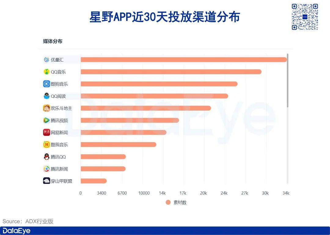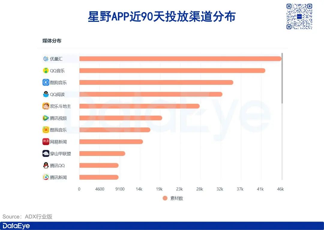 ADX行业版数据显示,近90天星野APP投放渠道主要为优量汇、QQ音乐、酷狗音乐、QQ阅读和欢乐斗地主。
