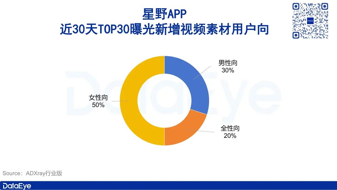 依据ADX行业版数据,DataEye研究院统计了近30天星野APP高曝光新增视频素材TOP30(图片生成类视频不计算在内),其中男性向素材9条,占比30%,女性向素材15条,占比50%,全性向素材6条,占比20%。
