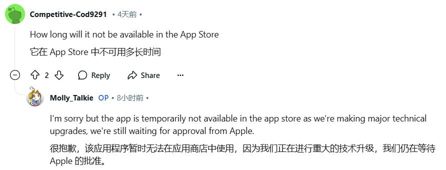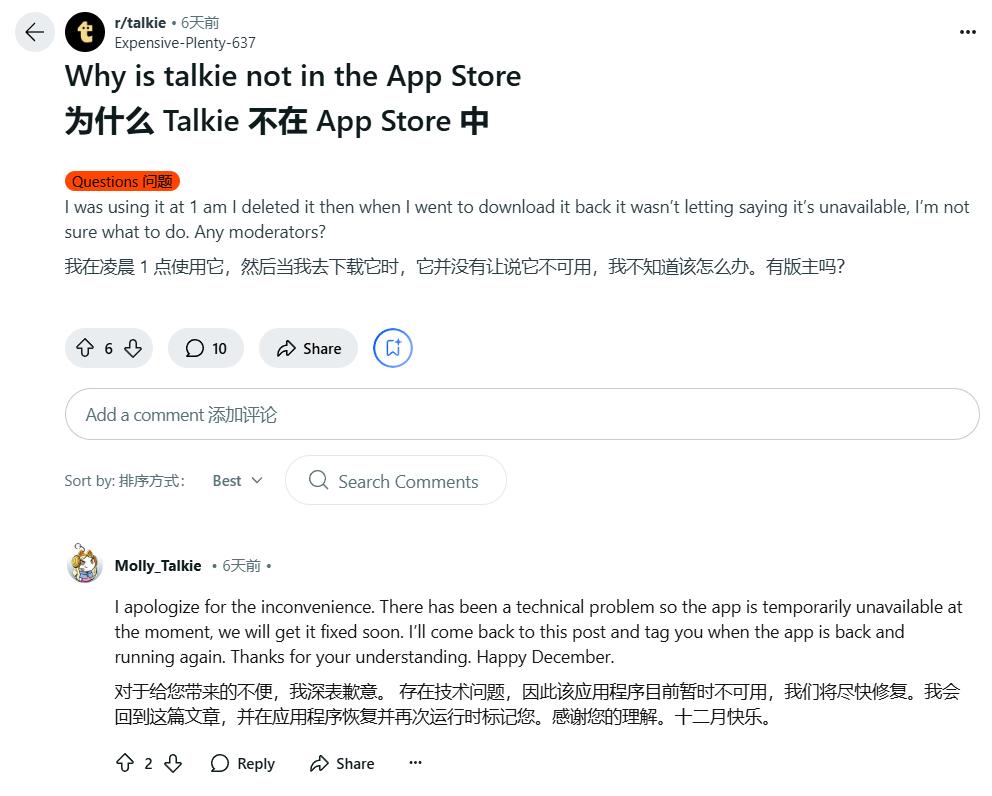 在Talkie被美国市场App Store下架后,Talkie官方人员早期回复网友问询时称“Talkie由于技术原因暂不可下载”;